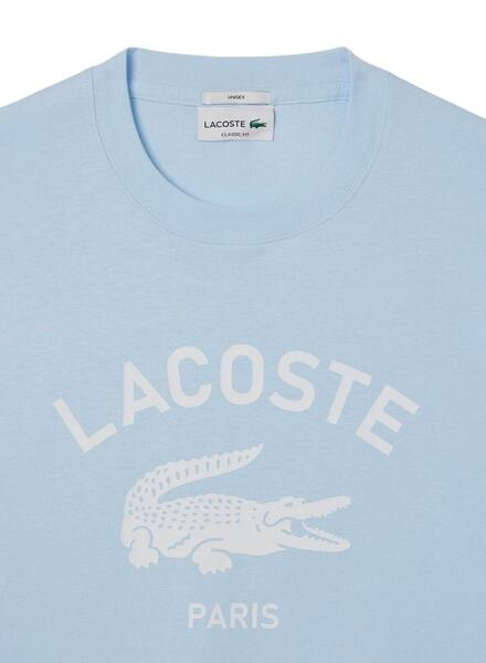 T-Shirt Lacoste. Blaue Farbe. Für Männer und Frauen. Runder Kragen. Kurze Ärmel. Reguläre Passform. Logo mit Kontrastdruck auf der Brust. Gesticktes Krokodil auf der Rückseite. Das männliche Modell trägt Größe M. Das weibliche Modell trägt Größe XS.