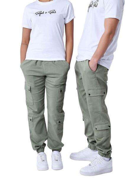 Hose Project X Paris. Cargo-Stil. Grüne Farbe. Elastischer Bund mit Kordelzug. Mehrere Seitentaschen und 2 Taschen hinten. Elastischer Saum.