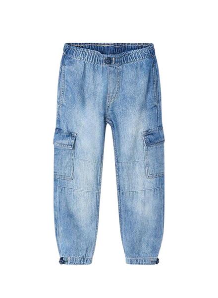 Mayoral Hose. Gewaschenes Denim-Gewebe. Seitentaschen. Cargotaschen. Eine Gesäßtasche. Verstellbarer Gummibund. Markenetikett in der Gesäßtasche. Unteres Ende mit verstellbarem Gummi.