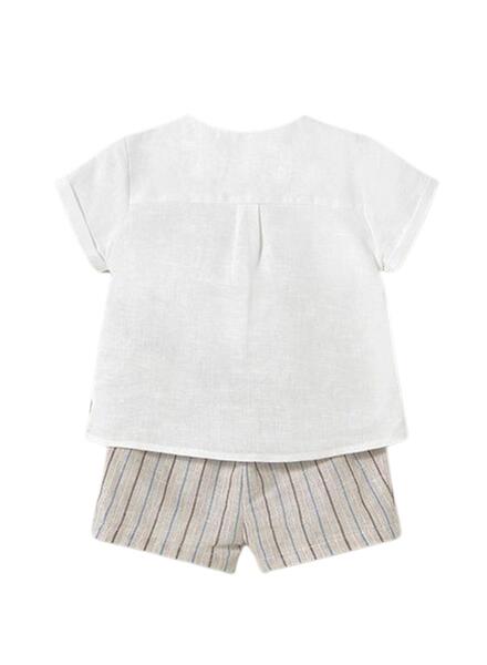 Set Mayoral. Bermuda aus Leinen. Elastischer Bund. Gestreiftes Muster. Weiße Leinenhemd. Runder Kragen. Kurze Ärmel mit Umschlag. Vorderverschluss mit drei Knöpfen.