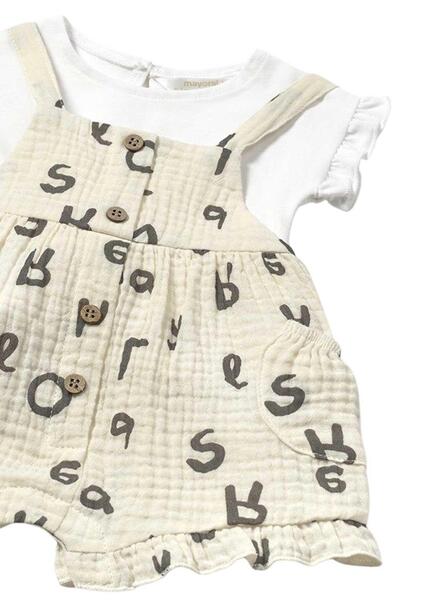 Mayoral-Set. Beige und weiß. T-Shirt mit Rüschen. Runder Halsausschnitt. Knopf hinten. Latzhose mit beigem Muster. Details mit Knöpfen. Elastischer Bund. Gekreuzte Träger.