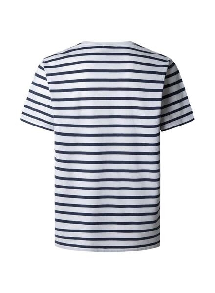 T-Shirt Pepe Jeans. Modell Striped Ego. Farbe Marineblau und Weiß. Bedruckt mit horizontalen Streifen. Runder Ausschnitt. Kurze Ärmel. Logo auf der Brust gedruckt. Reguläre Passform.
