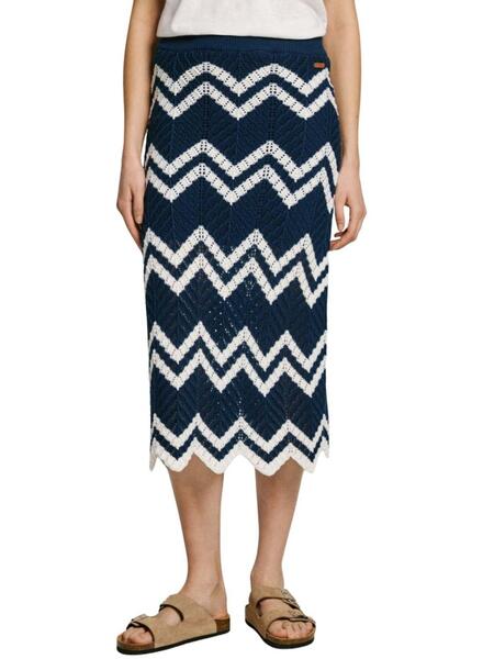 Rock Pepe Jeans. Modell Ollie. Marineblau und Weiß. Geometrisches Muster. Saum mit Zick-Zack-Finish. Elastischer Bund. Lochmusterstoff. Midi-Schnitt. Logo auf der Hüfte.