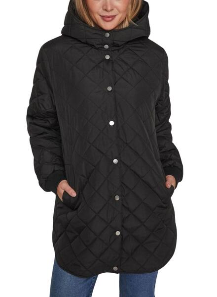 Damenjacke Vila. Modell Vitate. Farbe Schwarz. Verschluss mit Druckknöpfen. Hoher Kragen mit Kapuze. Gerader Schnitt. Ärmelenden gerippt. Gewebe mit Rautensteppung. Seitentaschen. Länge unterhalb der Hüfte. Abgerundeter Saum.