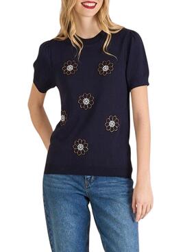 Naf Naf Pullover. Blumige Stickereien mit Perlen. Rundhalsausschnitt. Kurze Ärmel. Marineblau. Gerippte Abschlüsse. Reguläre Passform. Weicher Strickstoff.
