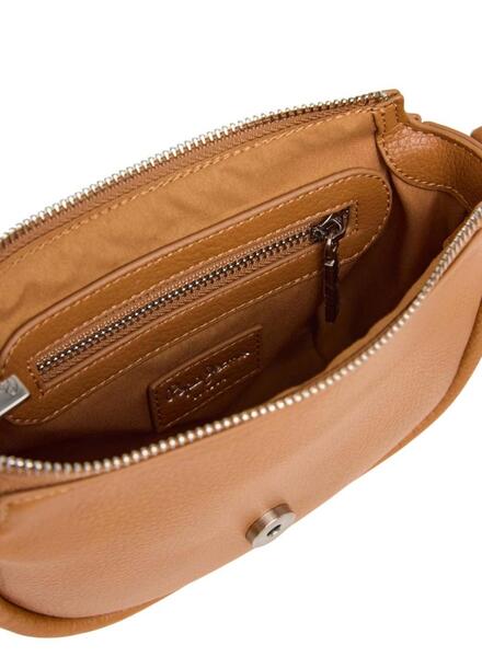 Tasche Pepe Jeans. Modell Crisha. Farbe Kamel. Klappeverschluss. Logo auf der Vorderseite graviert. Verstellbarer und abnehmbarer Schultergurt. Reißverschluss. Innentasche mit Reißverschluss. Maße: 21 cm x 6 cm x 15,5 cm.