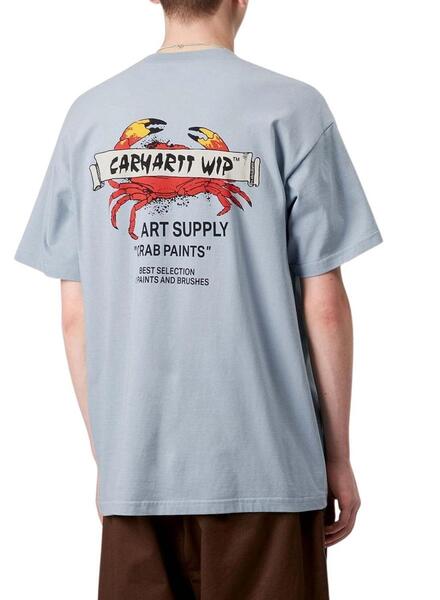 T-Shirt Carhartt. Blaue Farbe. Kurze Ärmel. Runder Halsausschnitt. Loose fit. Lockere Passform. Grafischer Druck auf der Brust und dem Rücken. Oversized Passform. Die Größe M wird vom Model getragen.