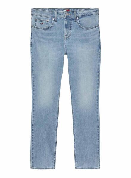 Jeans Tommy Jeans. Modell Scanton. Slim Fit. Hellblauer Denim. Verwaschener Effekt. Fünf Taschen. Markenpatch am Bund. Gesticktes Logo.