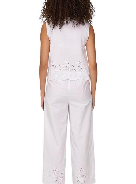 Bluse Only. Farbe weiß. Ärmellos. Kragen mit Rüschen. Vorderverschluss mit Knöpfen. Englische Stickerei. Gerüschter Saum. Reguläre Passform. Das Model trägt Größe S.