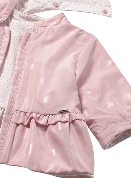 Windbreaker Wendbar Mayoral. Rosa und weiß. Gepunktetes und herzförmiges Muster. Details mit Rüschen. Mit Kapuze. Hauptverschluss mit Reißverschluss.