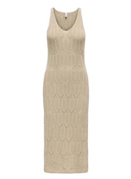 Kleid Only. Modell Mea. Farbe beige. V-Ausschnitt. Ärmellos. Midi-Länge. Figurbetonter Schnitt. Waschen bei max. 30°C im Schonwaschgang. Leicht durchbrochen.