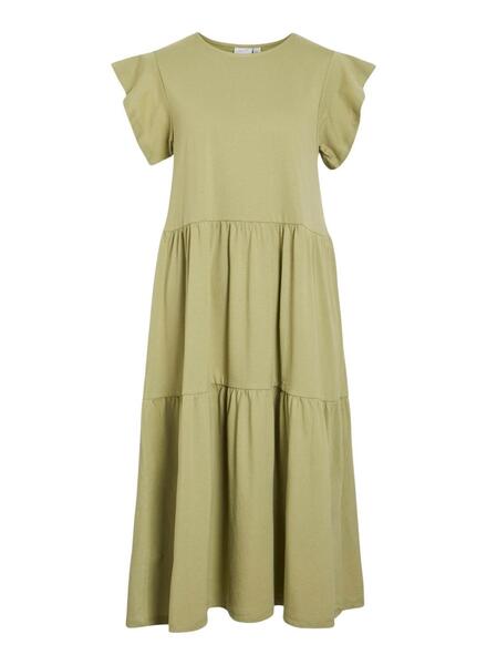 Kleid Vila. Weicher Stoff. Midi-Format. Grüne Farbe. Kurze Ärmel. Mit Rüschen. Runder Ausschnitt. Reguläre Passform. Das Model trägt Größe S.
