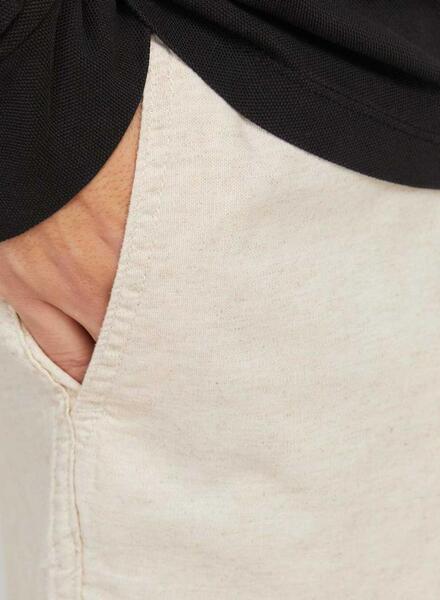 Bermudas von Jack and Jones. Modell Jaiden. Farbe beige. Elastischer Bund mit Kordelzug. Vier Taschen. Markenlogo gestickt. Länge bis zum mittleren Oberschenkel. Lockerer Schnitt. Stoff aus Leinenmischung. Vorderer Verschluss mit Reißverschluss und Knopf. Gürtelschlaufen an der Taille.