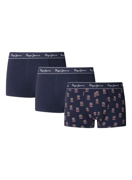 3er Pack Pepe Jeans Boxershorts. Marinefarbe. Baumwoll-Elastan-Mischung. Regulärer Schnitt. Einer mit Londoner Print und zwei einfarbig. Bund mit Markenlogo.